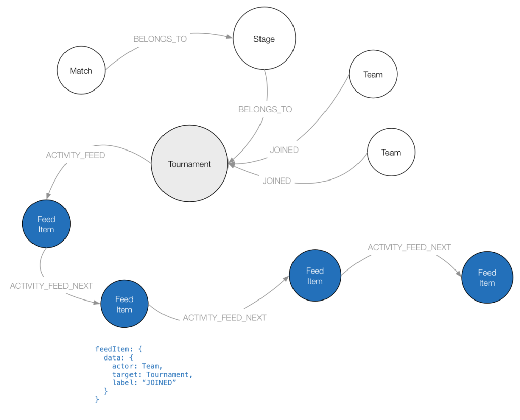 GetStream.io Although they don’t expose their graph model, one can conclude that activities are stored as a single node with actor, object and target being reference properties with the format "<ObjectType>:<ObjectId>. For example