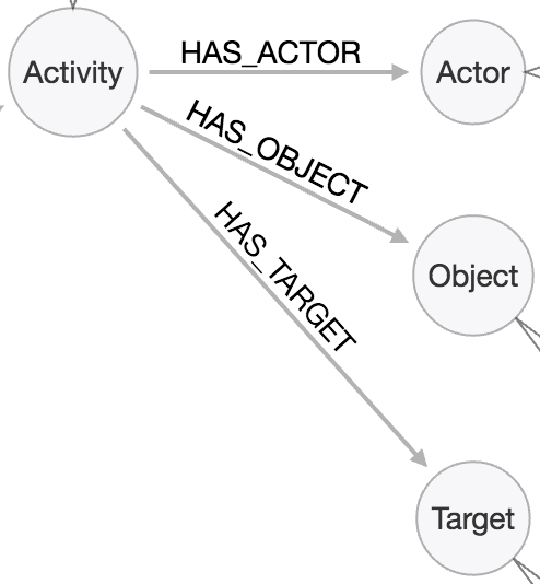 In their implementation, entities nodes be cross-linked from many activities. While this helps optimize the number of nodes the system creates, it makes it more difficult to perform a delete operation, since any object (actor, object or target) can be referenced elsewhere, and therefore risk leaving orphan nodes in the system. Also, I’ve not seen a relationship to a parent entity, say a user or a feed group. They are rather isolated activities. I’m not sure how one would query for multiple activities for a given user.