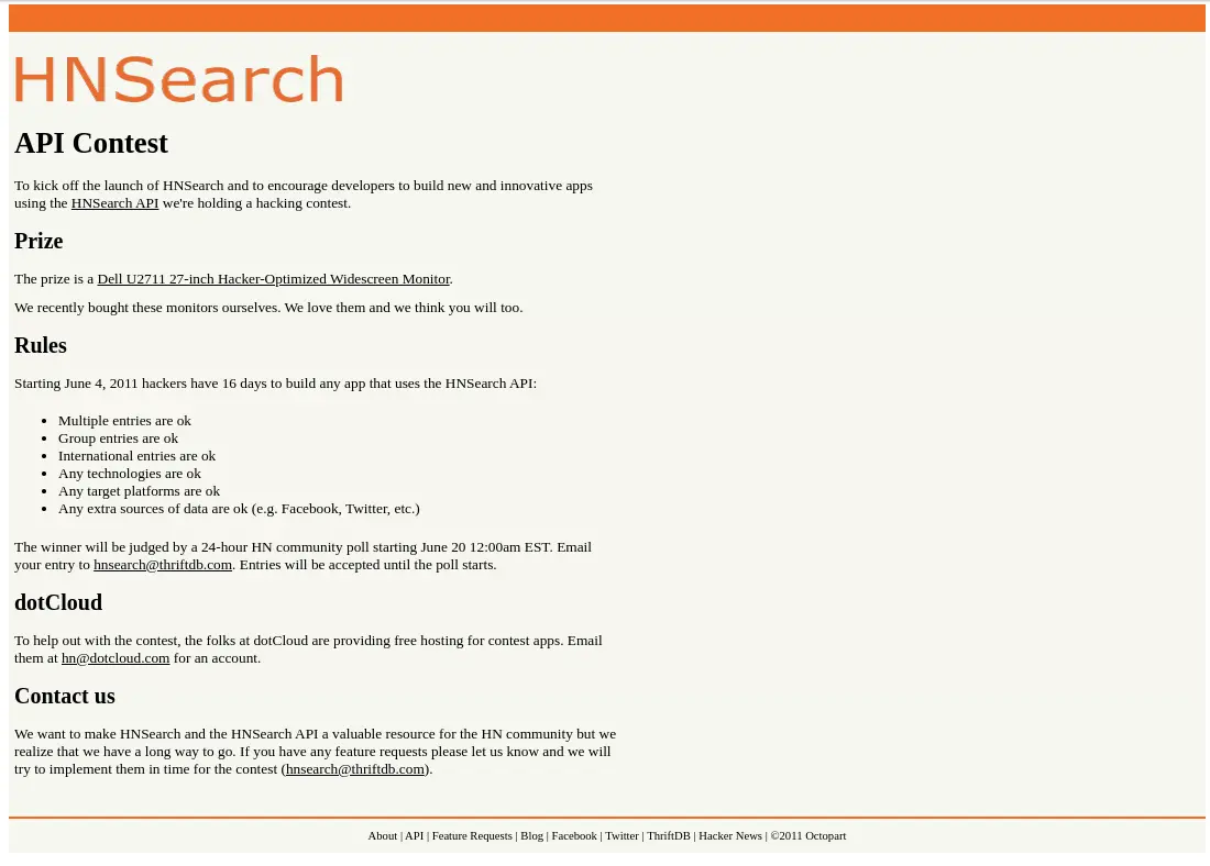 The official launch of HNSearch was posted by Andres Morey, founder of Octopart (W07) (aka andres), on June 4, 2011. It was launched as a competition to build the best thing on top of the HNSearch API where the winner would get a 27-inch Dell monitor.