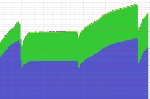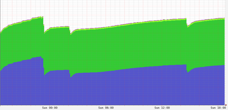 最初の山: 環境変数 RUBY_GC_HEAP_OLDOBJECT_LIMIT_FACTOR=1.2 + ruby 2.1.1 + fluentd v0.10.44 + cool.io v1.2.1 + msgpack v0.5.6 # 上昇率は減ったが依然として横ばいにならない。