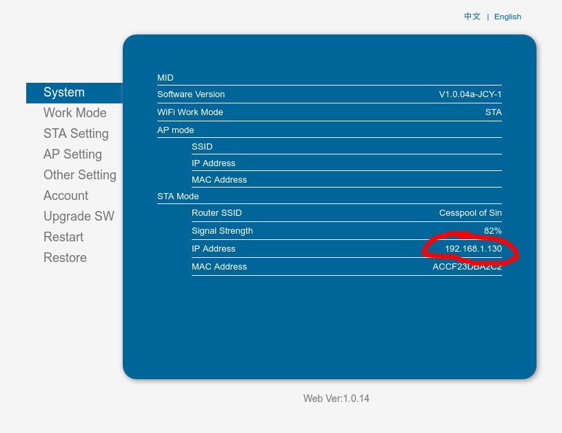 - Log into the web portal again. take note of the STA IP on the info tab.