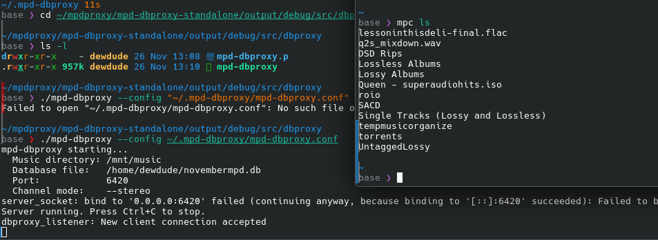 But it also caused it's own issue; you couldn't update with mpd anymore. You had to update with mpd-dbcreate, then restart mpd to load the new database. This maybe wasn't really that annoying, I put up with it for a few months. After building mpd-dbcreate my brain was kind of on the track of this would require the ability to commuinicate with mpd in a way that the client API or library provided...which mpd-dbcreate had stripped out of it anyway. But, it turns out, there is a way...