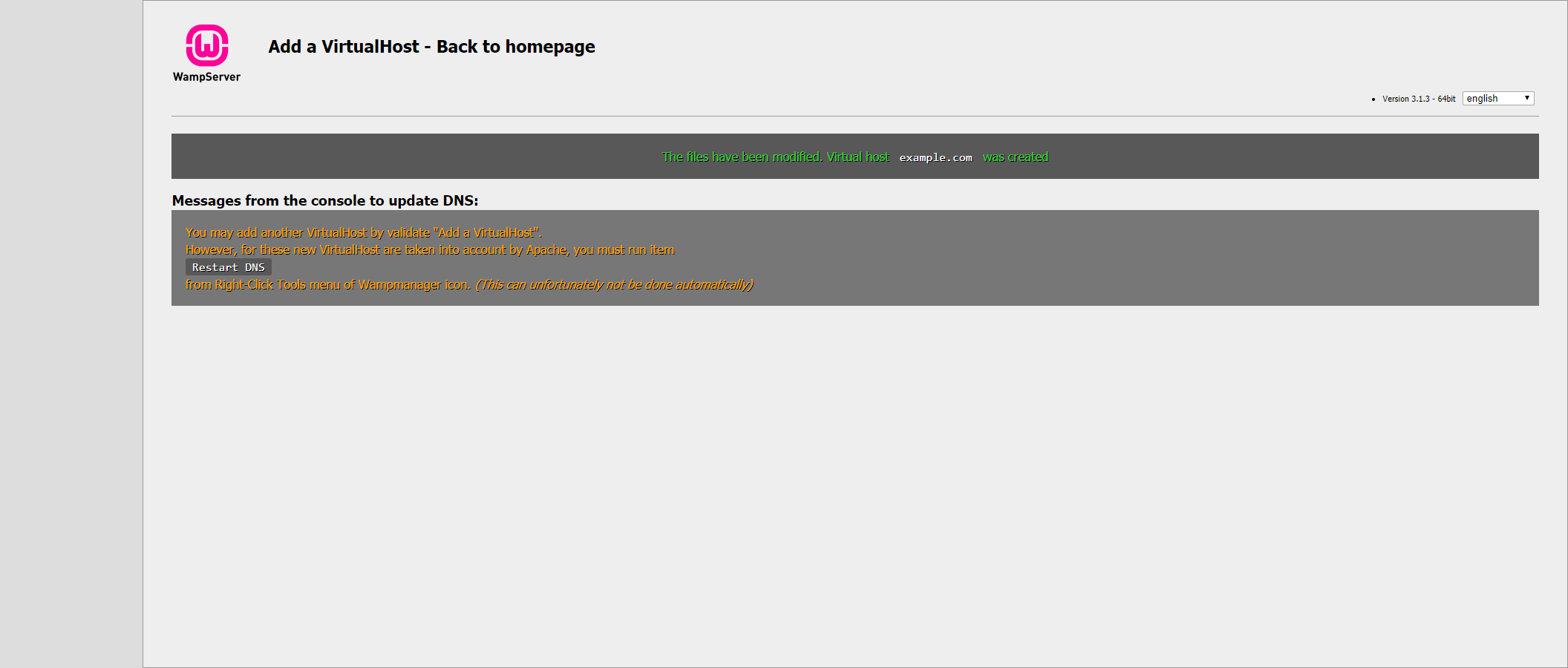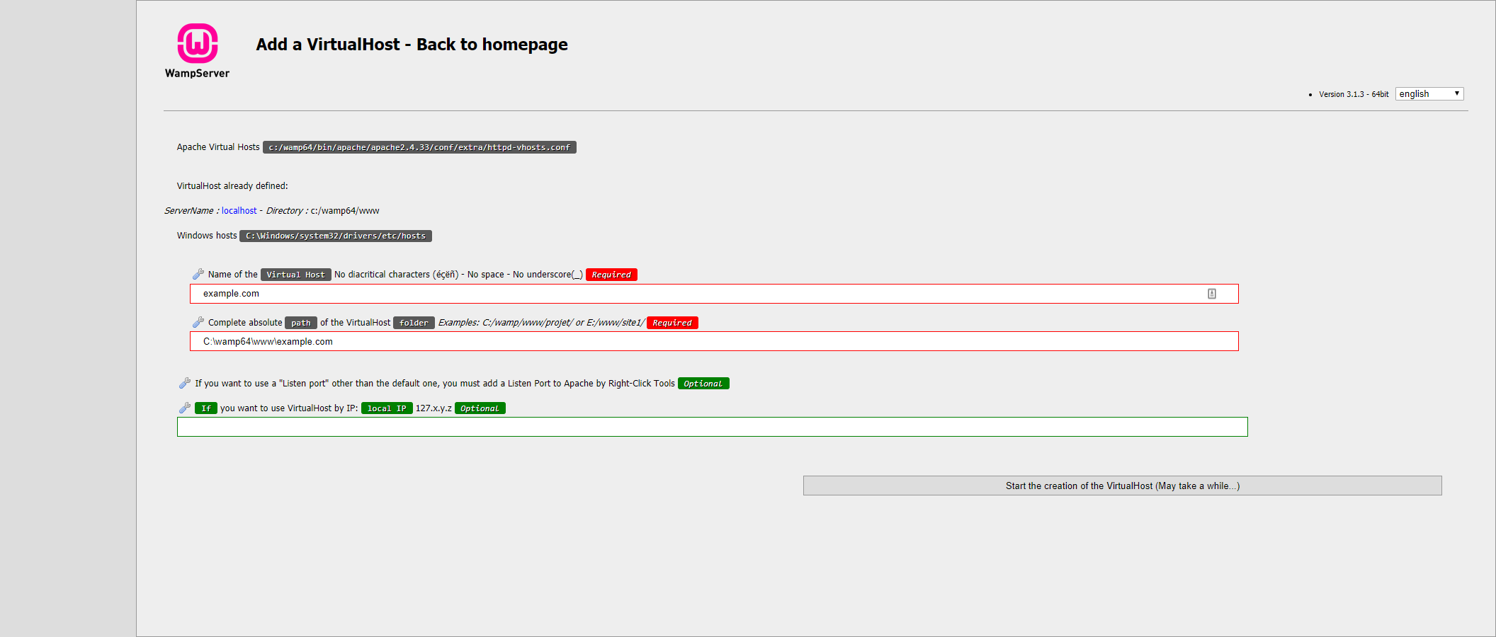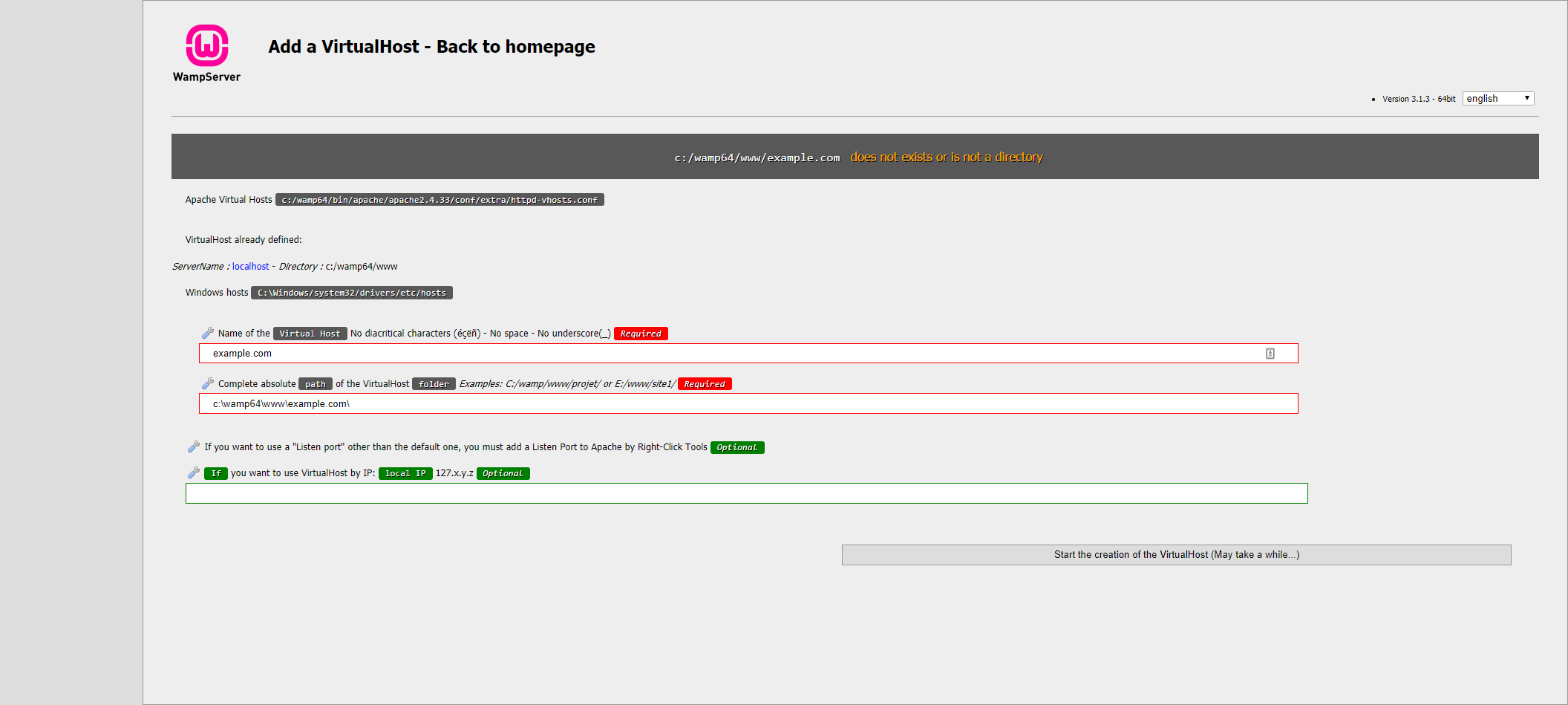 After installation of WAMP you need to go to http://localhost using your browser and set up new virtual host. Click Add a Virtual Host under a Tools menu. That will take you to the next step: