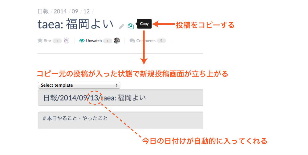 朝、仕事はじめるときに、昨日の自分の日報をタイトル右のアイコンからコピーして、今日の日報を