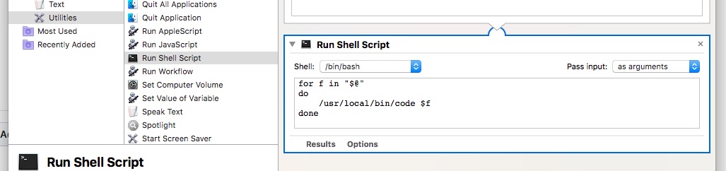 Run Shell Scriptyang dapat ditemukan di dalam Library > Utilities - Ubah Pass input sebagai Argument, untuk menangkap result dari action sebelumnya dimasukkan ke dalam arguments ke script yang dijalankan di action ini