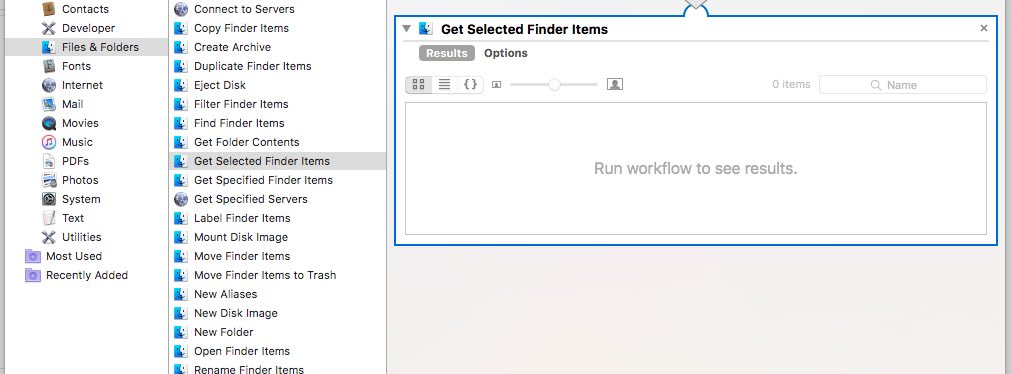 Get Selected Finder Itemyang dapat ditemukan di dalam Library > Files & Folder - Setelah action tersebut masukkan Action