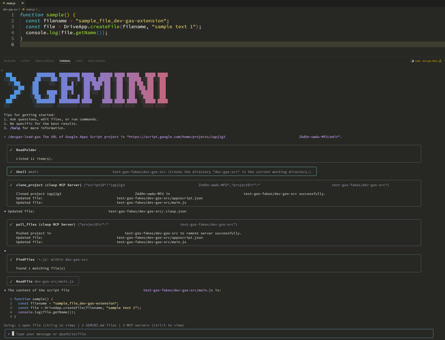 Visual Studio Code (VSCode) is widely recognized as a premier source code editor. The release of the Gemini CLI has dramatically transformed script development by bringing advanced AI capabilities directly into the terminal. In particular, combining Gemini CLI with VSCode creates a powerful development ecosystem, highly effective for languages typically executed locally, such as Python, Node.js, Go and so on. Beyond coding, this setup streamlines content creation, including articles and papers, by leveraging AI for drafting and editing. Ref For cloud-based Google Apps Script (GAS) development, the standard approach involves using VSCode alongside Clasp to manage projects locally. Ref Integrating Gemini CLI into this established workflow promises significant synergistic effects. A recent update has further expanded these possibilities by enabling Clasp to function experimentally as a Model Context Protocol (MCP) server, allowing LLMs to directly interact with GAS project structures. Ref Furthermore, to address security concerns when executing AI-generated GAS code, I have introduced a "fake sandbox" environment for safer testing. Ref and Ref With the recent release of Gemini CLI Extensions, which allow for custom AI tools and specialized workflows, combining these assets creates a vastly superior developer environment. In this article, I will introduce next-level Google Apps Script development by leveraging the combined power of Gemini CLI Extensions and VSCode.