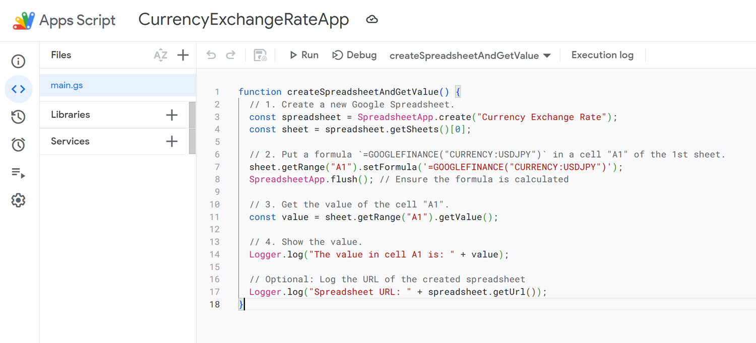 const spreadsheet = SpreadsheetApp.create("Currency Exchange Rate");