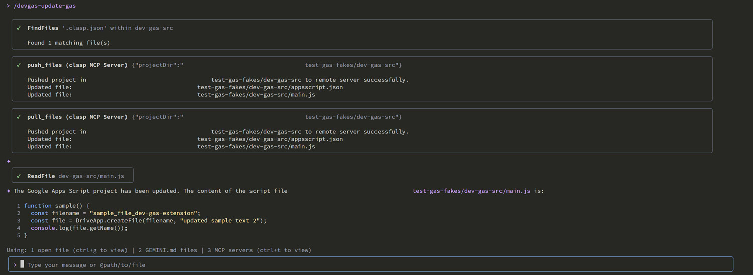 gas-fakessandbox provides a safe environment for testing AI-generated or modified scripts before deploying them. - Streamlined Workflows: Custom Gemini CLI commands automate common tasks like creating, cloning, testing, and updating projects.