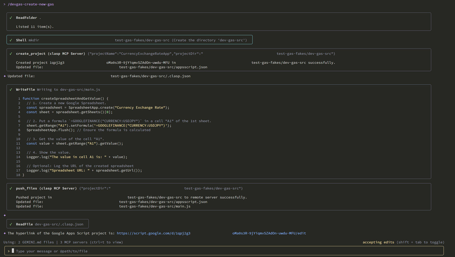 - AI-Powered Development: Leverage the Gemini CLI to generate, modify, and manage your GAS projects using natural language prompts.