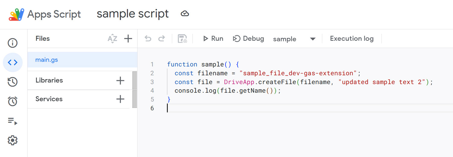 Modify the script by updating the file content to "updated sample text 2" at the local file. Don't still update Google Apps Script project on Google Drive.