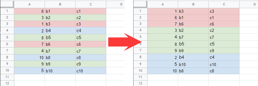 }- In this sample, before the sort of background color is run, the column "A" is sorted with "ASCENDING".