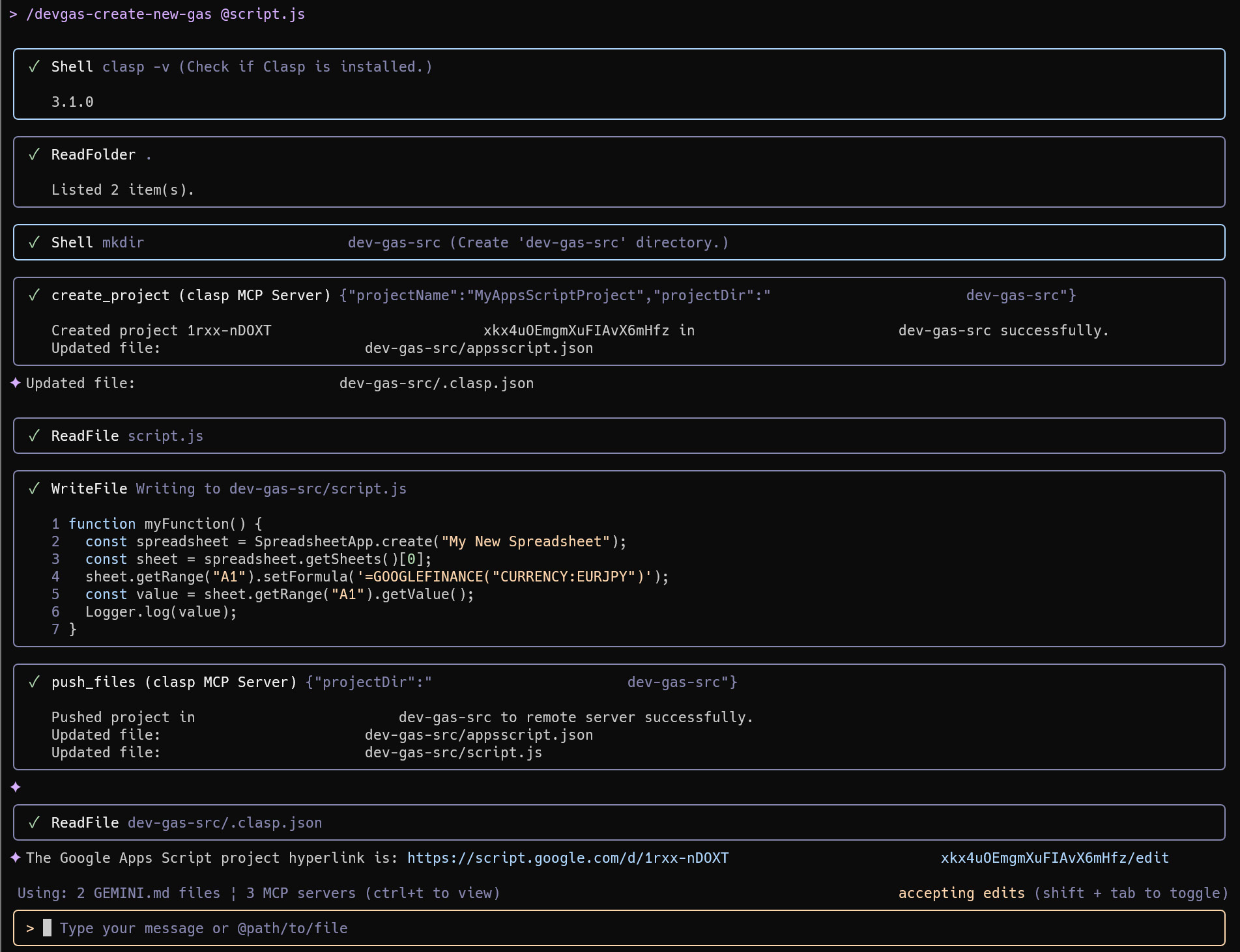 gas-fakes, Clasp, and the Gemini CLI extension creates a seamless development workflow, from local testing to cloud deployment. - AI-Powered Development: The Gemini CLI extension allows you to generate and test Google Apps Script using natural language prompts, accelerating the development process.