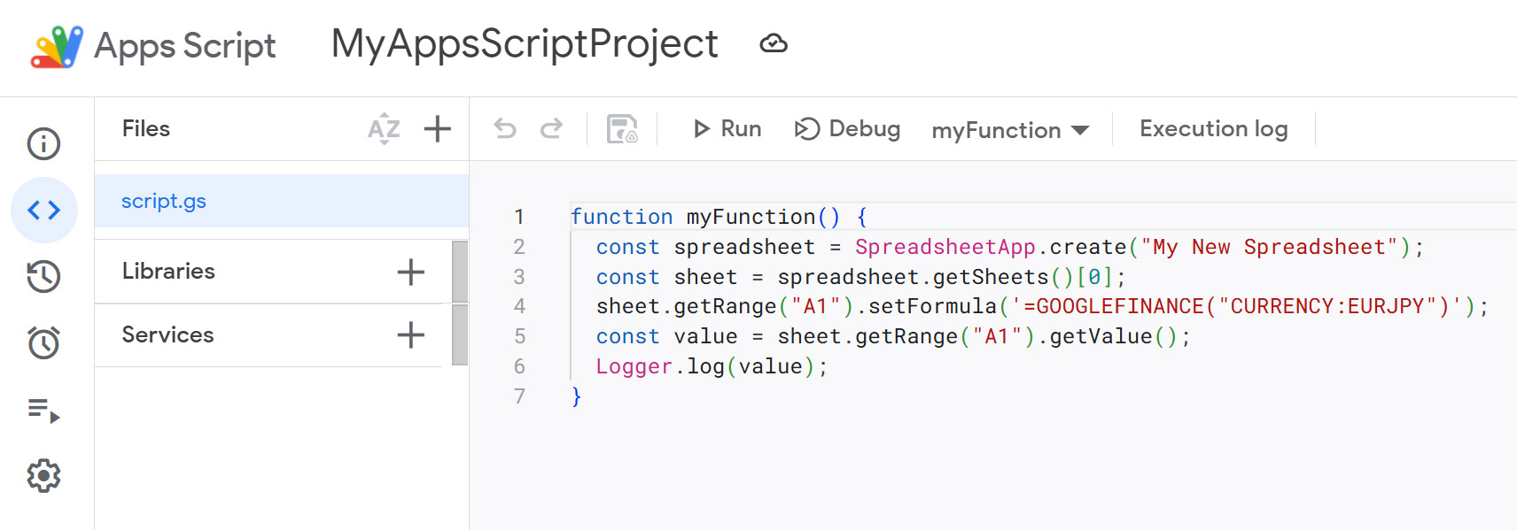 /devgas-test-gas Create a new Google Spreadsheet by putting a formula `=GOOGLEFINANCE("CURRENCY:USDJPY")` in cell "A1" of the first sheet. Then, get and show the value of cell "A1". (Note: `gas-fakes` has no `getActiveSheet()` method. In this case, use `getSheets()[0]`.)