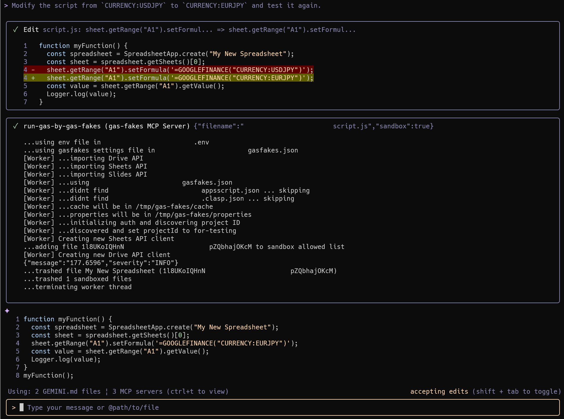 As a next step, gas-fakes was implemented as an MCP (Model Context Protocol) server. Ref Ref This allowed users to interactively use gas-fakes as a tool from the Gemini CLI, but it was still limited to use within a specific directory.