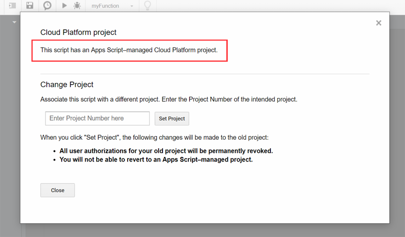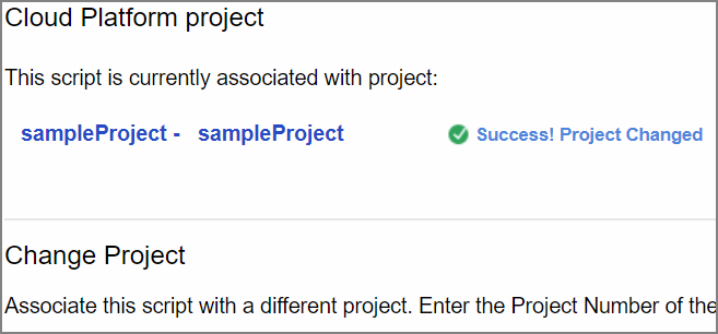 - When "Success! Project Changed" is shown, it means that Cloud Platform Project was linked to GAS project.