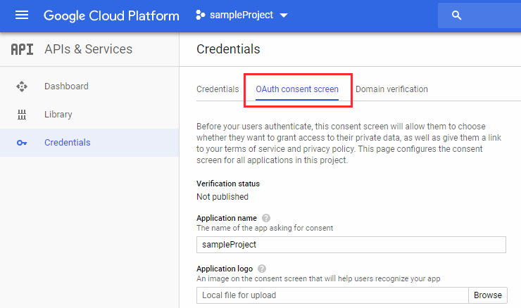 - Before create the credential, open "OAuth concent screen" like below. And input "Application name" and click "Save" button.