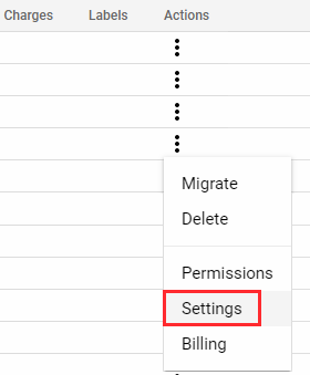 - For the cerated Cloud Platform Project, open the setting page by clicking "Settings" like below.
