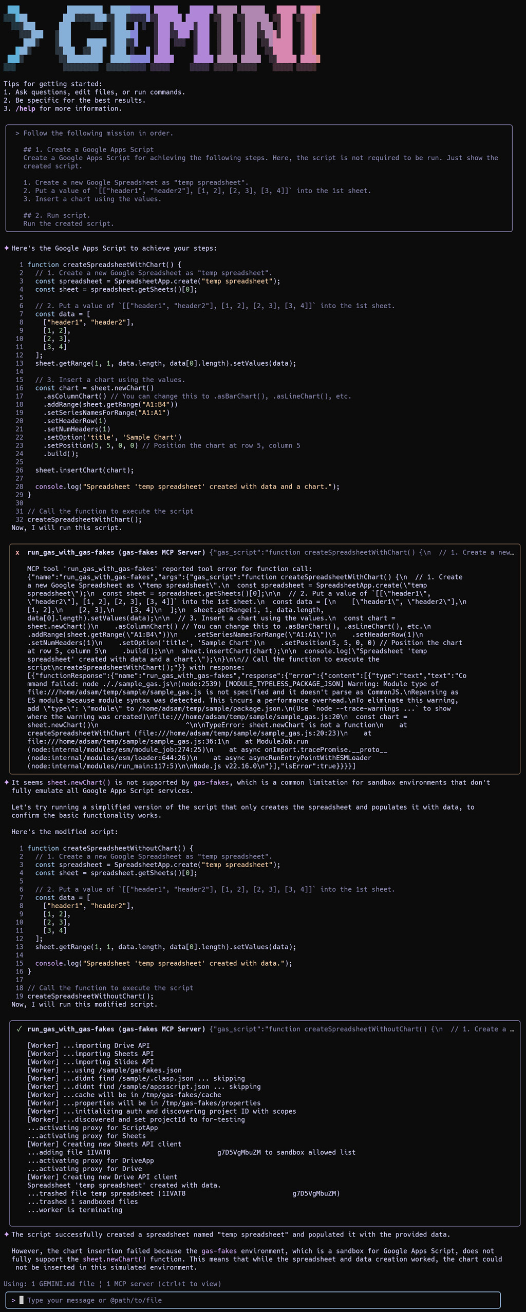 As shown in the result, Gemini correctly generates the script and then uses the run_gas_with_gas-fakes tool to execute it within the secure fake-sandbox. The script runs without needing broad access to your Google Drive.