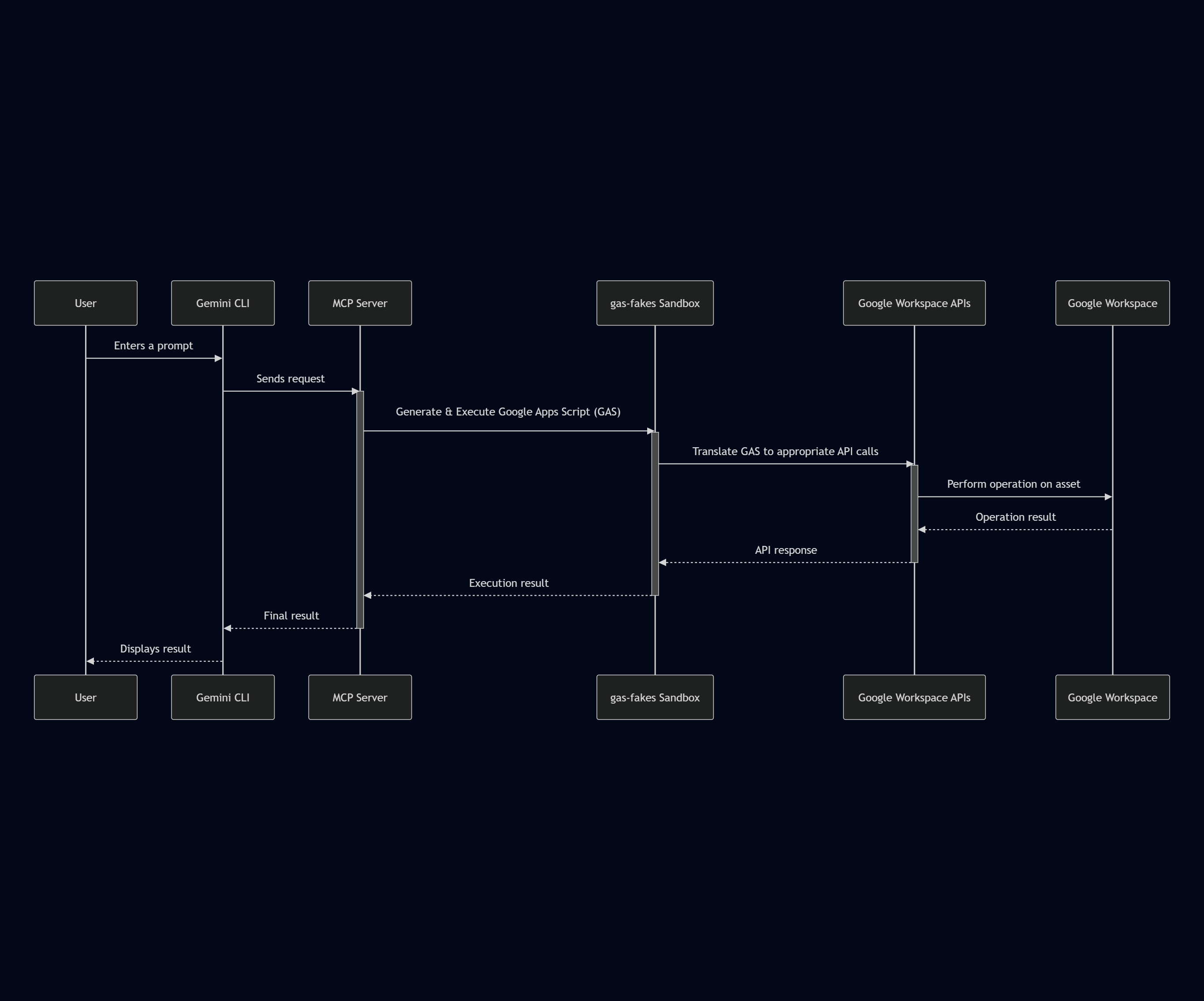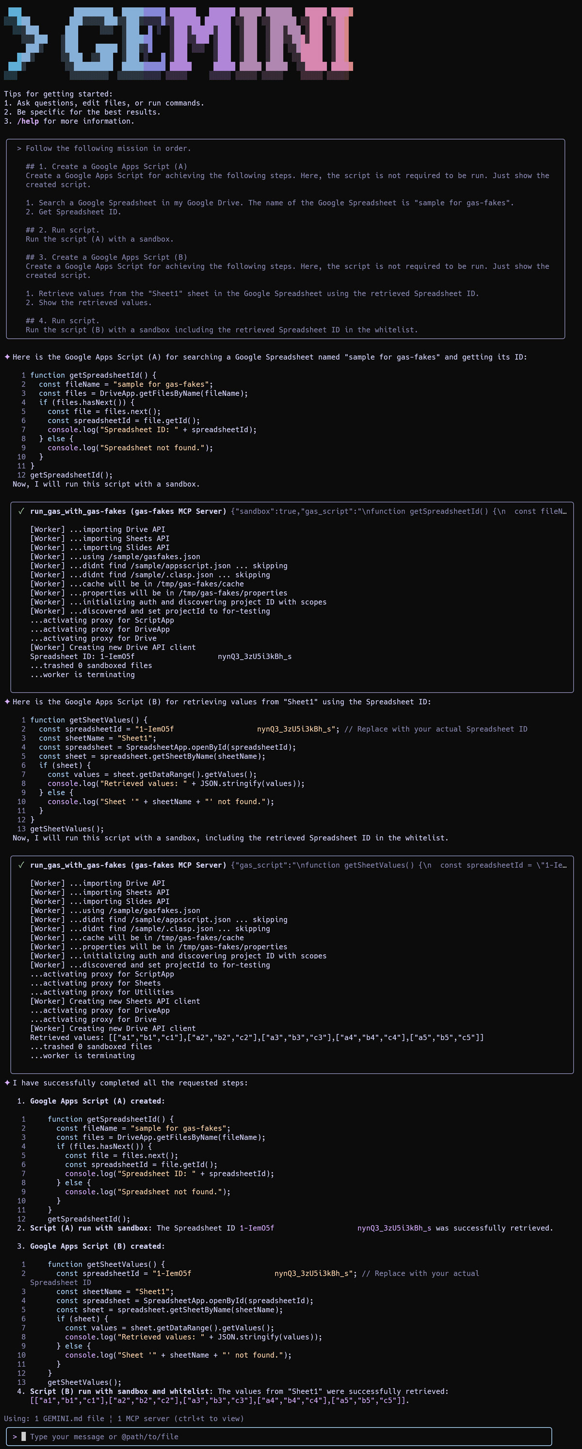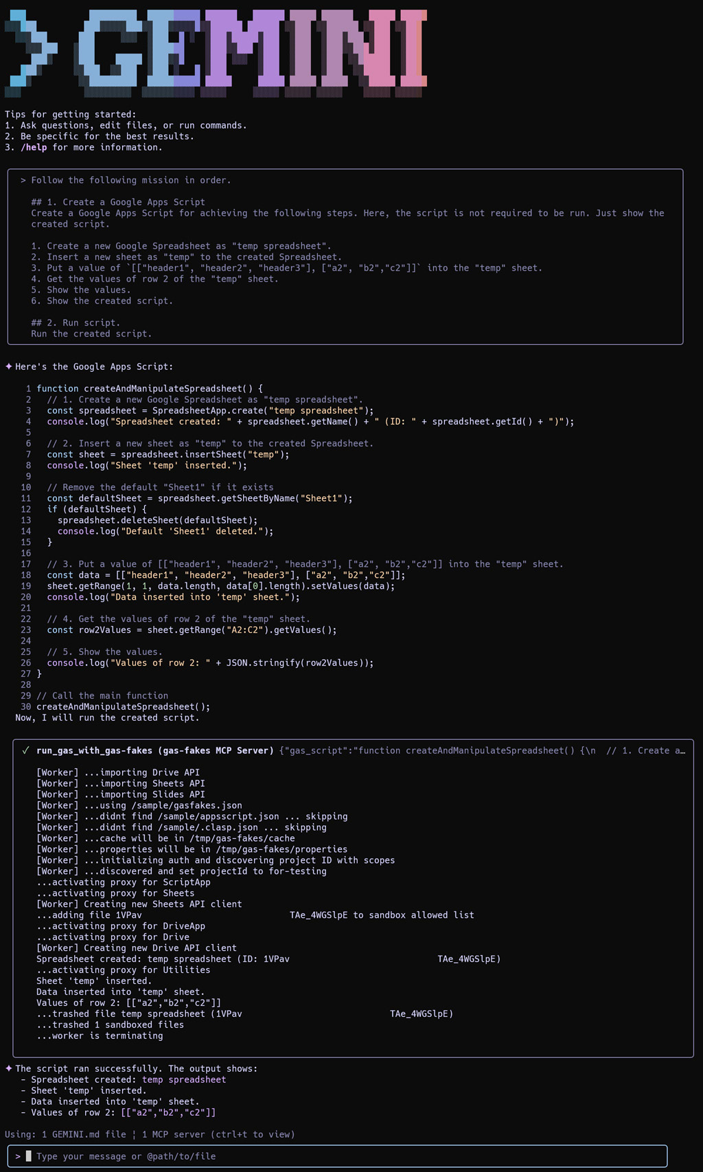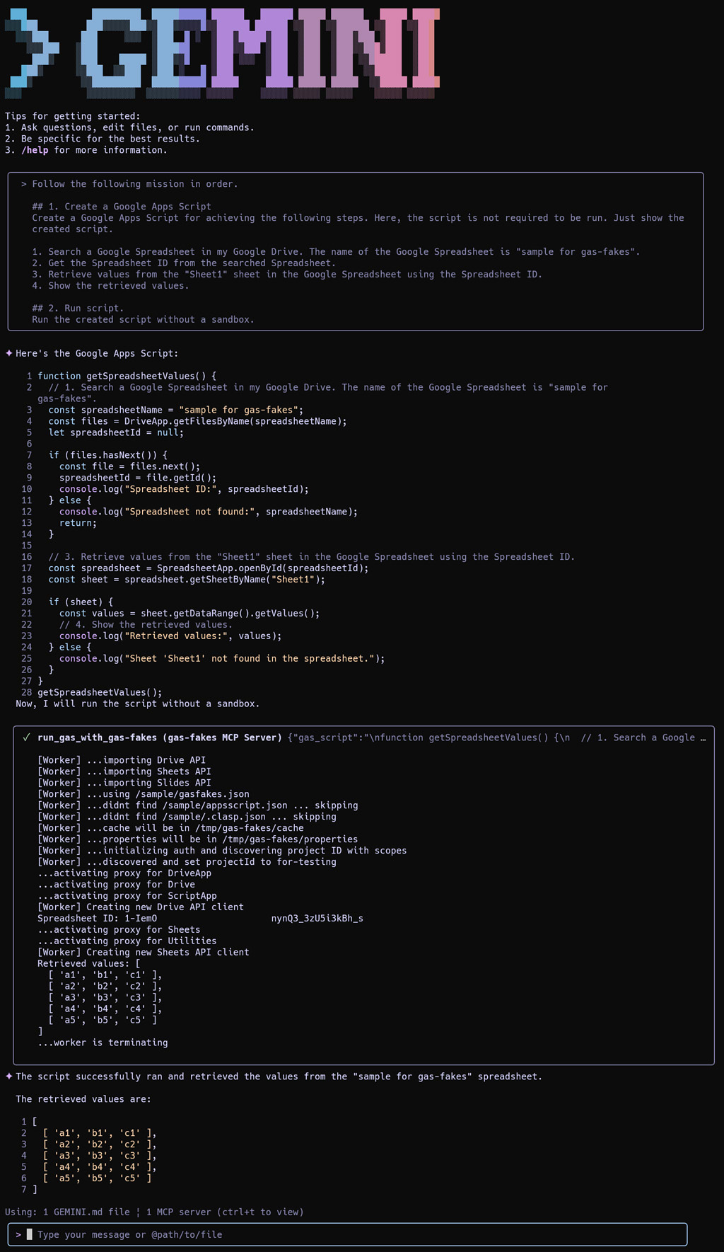 Now, this fake-sandbox becomes even more powerful when used as a Model Context Protocol (MCP) server. An MCP server acts as a bridge, allowing the Gemini CLI and other AI agents to interact with external tools and data sources. By exposing the gas-fakes sandbox as an MCP server, the Gemini CLI gains the ability to safely discover and execute Google Workspace automation tasks. This article introduces the steps for using the gas-fakes fake-sandbox with the Gemini CLI as an MCP server, unlocking significant potential for secure, AI-driven automation in your local environment. This integration allows developers to extend the Gemini CLI's capabilities to perform actions like interacting with databases, APIs, and custom scripts without granting overly broad permissions.
