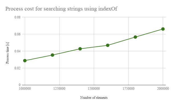 - Process cost of search by indexOf() was the lowest of all methods.