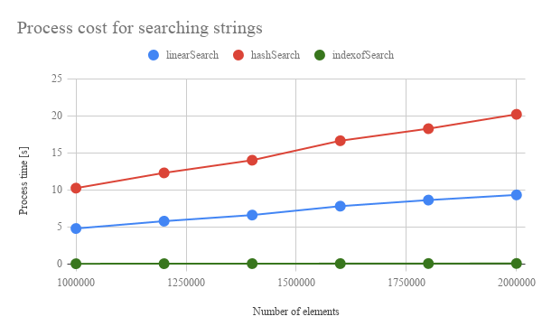 Fig 1. Number of elements vs. processing time (process cost) for searching 3 strings. The solid lines with the color of red, blue and green mean the result from the search using hash, the linear search and the search using indexOf, respectively.