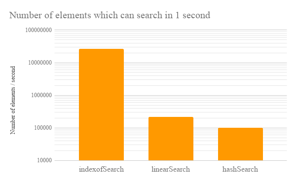 - From the sample script, both the linear search and the search using hash process all elements in the array using the for loop. On the other hand, the search using indexOf doesn't process all elements using the for loop. The index of the element with the found string is directly retrieved using indexOf. When the string is found, the elements in the array are removed from the start index to the index of element with the found string. By this, the array length becomes small. This flow is repeated until to find all strings for searching. So it is considered that the search cost of indexOf which doesn't process all elements using the for loop became the lowest of all. This may indicate that the scan for indexOf() is different from it for the general for loop.