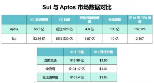 市场常常将Aptos与Sui对比进行估值。Aptos Labs在种子轮和A轮中累计筹集了3.5亿美元,估值超过20亿美元。而Sui的A轮及B轮融资累计筹集资金3.36亿美元,估值同样超过20亿美元,与Aptos的融资规模及估值均基本接近。