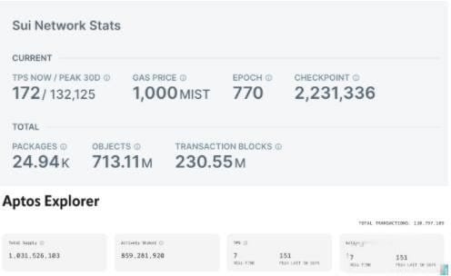 根据Sui测试网流览器数据,Sui Network近30天的TPS峰值达到132,125,而Aptos上线初期最高TPS仅达到2,107,近30日峰值仅151。虽然测试网与主网数据自然有所差距,但市场普遍认可的Sui技术方面更优显然不是空谈。