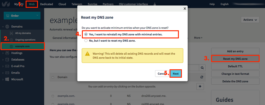 php bin/console cache:clear && php bin/console cache:warmupAfin de lier votre nom de domaine à votre VPS. Pensez à copier l'adresse IP du VPS située dans votre espace client OVH. Rendez-vous ensuite dans la partie Web de l'espace client et sélectionnez votre nom de domaine. Cliquez ensuite sur l'onglet Zone DNS puis sur la droite sur Réinitialiser ma zone DNS.