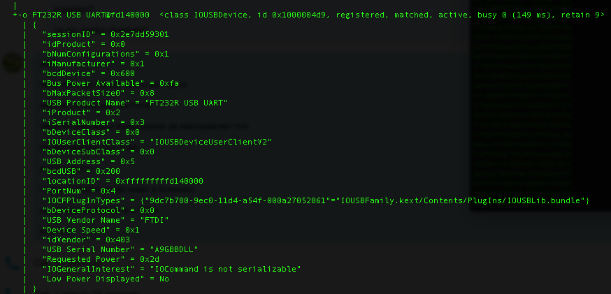 - Run system_profiler -detailLevel full in order to find device details with a plugged in FTDI board. More info about the fields and how matching is done. “idVendor” = 0x403 “idProduct” = 0x0 “bcdDevice” = 0x600
