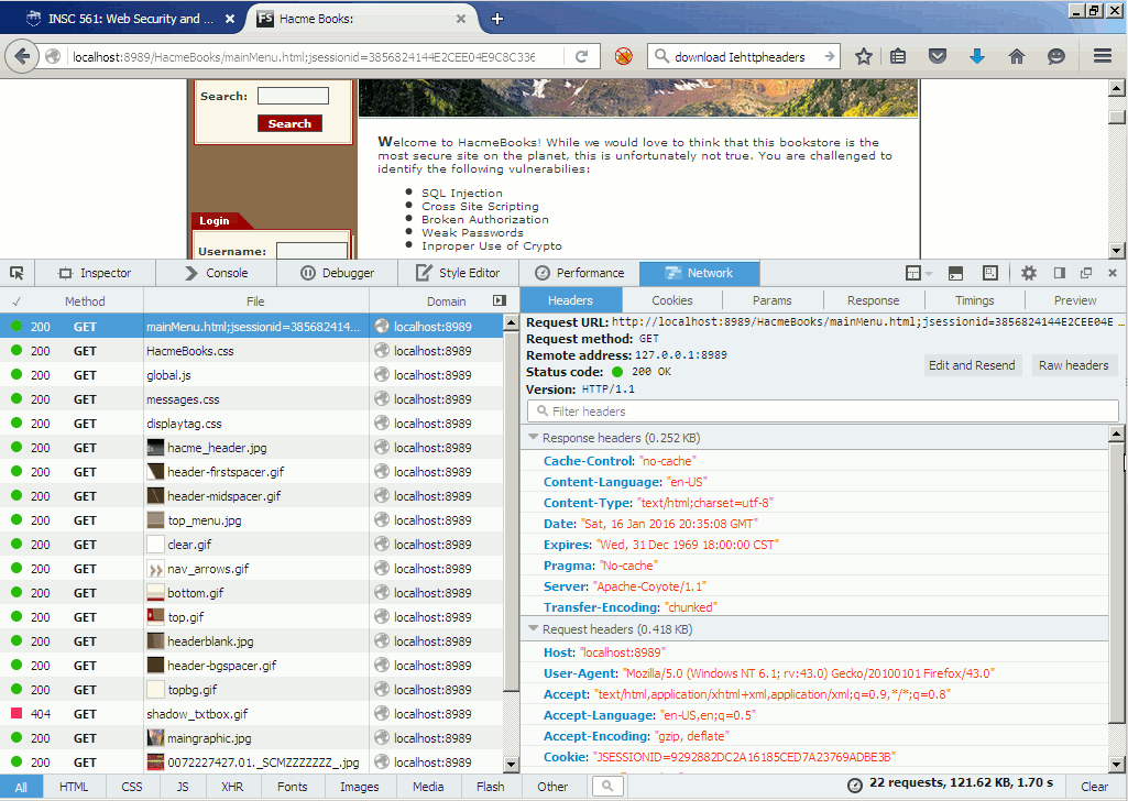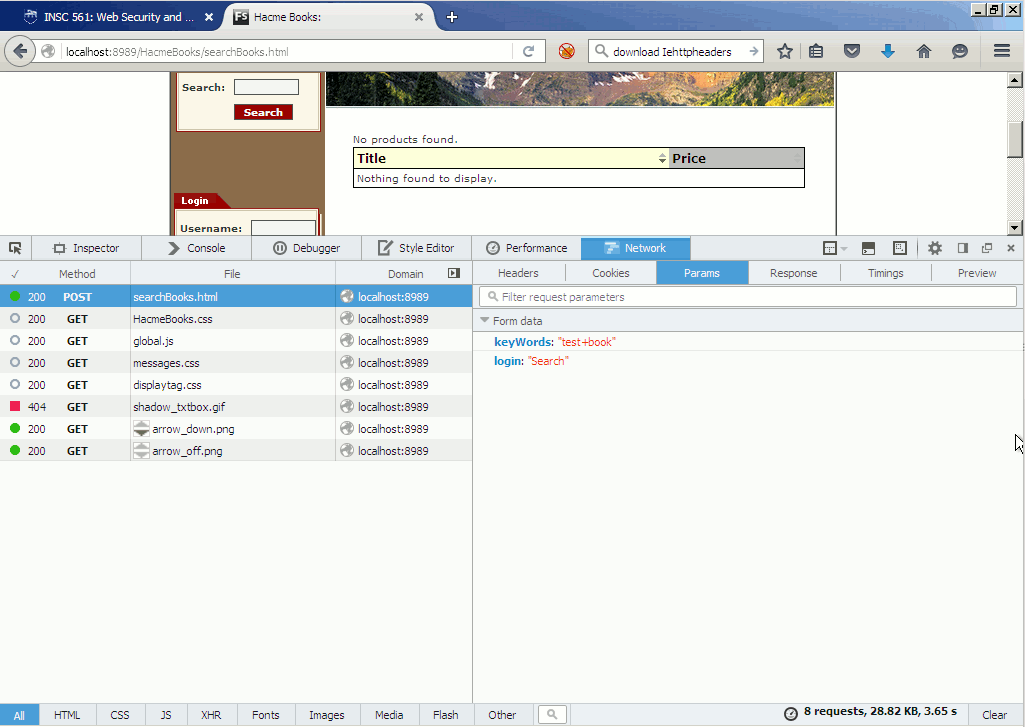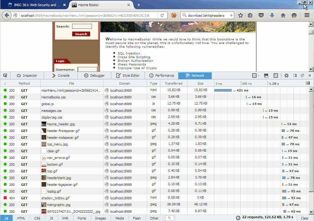 Now that I was on my own VM with a decent version of Firefox (43.0.4) I was able to try the plugins that the lesson and book recommended. Unfortunately none of them worked (technically foxyproxy worked, but without a proxy to run through it isn't going to give you anything). On the other hand, Firefox, by default, comes with a tool that does basically everything the other plugins did on IE, but in a much nicer tool. In recent versions of firefox, go to the menu and select “Developer” (has a wrench for an icon), then select the “Network” option. Now you can browse to the HacmeBooks page and you will see all the requests show up: