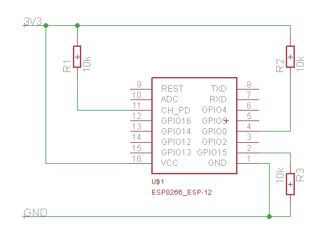 No começo estava com medo do ESP-12 não estar funcionando pois o unico LED da placa ligava fraquinho. Foi aí que eu resolvi dar uma pesquisada na internet e descobri que era necessário "ligar" outros terminais além do VCC/GND. Foi aí que eu descobri o seguinte esquema básico de ligação: