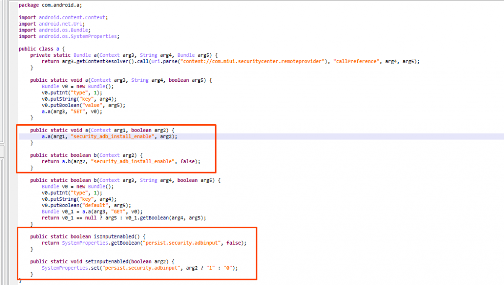 分析过程:回到我们上次提供的方法,对 SecurityCenter 的 AdbInstallActivity 的某个字段的 isEnabled 方法进行 hook,让它的返回值返回 false。我们对比一下 miui9 和 miui11 的代码,发现它们一模一样,都是访问 permcenter_install_intercept_enabled,在配置文件里没有,我们主动添加这一项即可。
