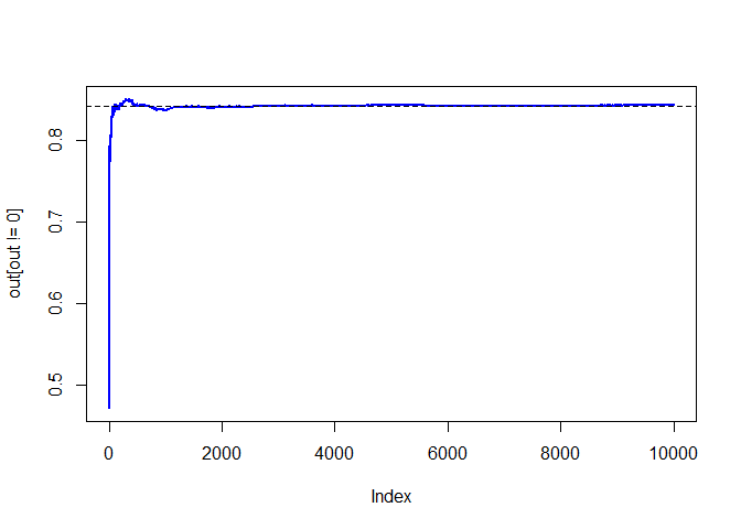 abline(h = mvtnorm::pmvnorm(lower = a, upper = b, mean = 0, sigma = S), lty=2)However, if the integration is not over a hyperrectangle, the current approach cannot be used, and we need to resolve to other techniques.