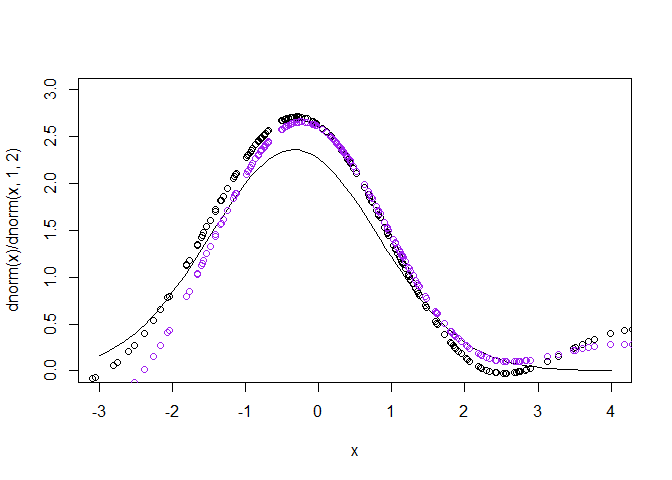 #> Warning in check.nfold(cv, nfold, sigma, nnu): Only a single 'sigma' value is specified, while cross-validation serves to optimize 'sigma'.curve(dnorm(x, 1, 1)/dnorm(x, 0, 2), -5, 5, lwd = 2, ylim = c(0, 4))