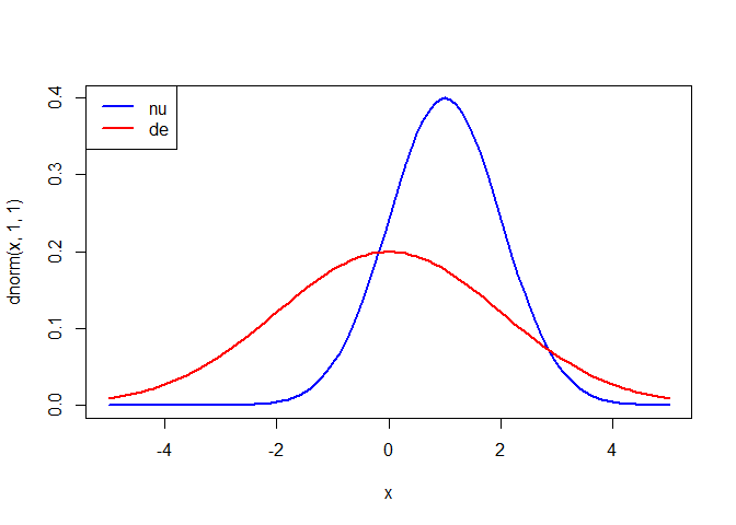 legend("topleft", legend = c("nu", "de"), col = c("blue", "red"), lwd = 2)We define a kernel model for the density ratio as