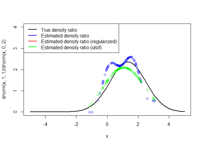 legend("topleft", legend = c("True density ratio", "Estimated density ratio", "Estimated density ratio (regularized)", "Estimated density ratio (ulsif)"), lwd = 2, col = c("black", "blue", "red", "green"))