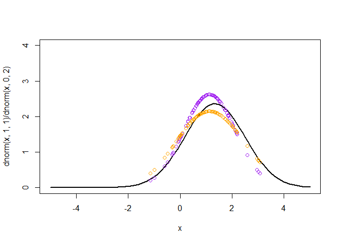 curve(dnorm(x)/dnorm(x, 1, 2), from = -3, to = 4, ylim = c(0, 3))