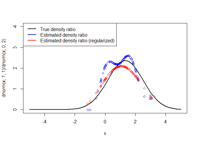 legend("topleft", legend = c("True density ratio", "Estimated density ratio", "Estimated density ratio (regularized)"), lwd = 2, col = c("black", "blue", "red"))
