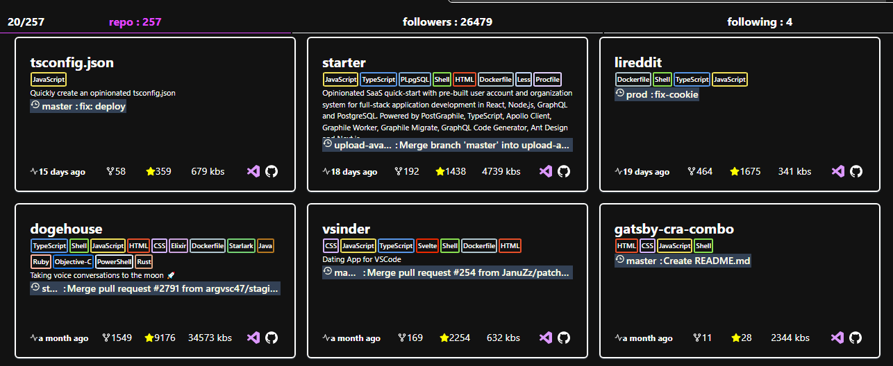 I used ben awad's profile because his repositories actully have stars ,forks and multiple languages which is the brief info i want to see at a glance before i decide to click on it and see more