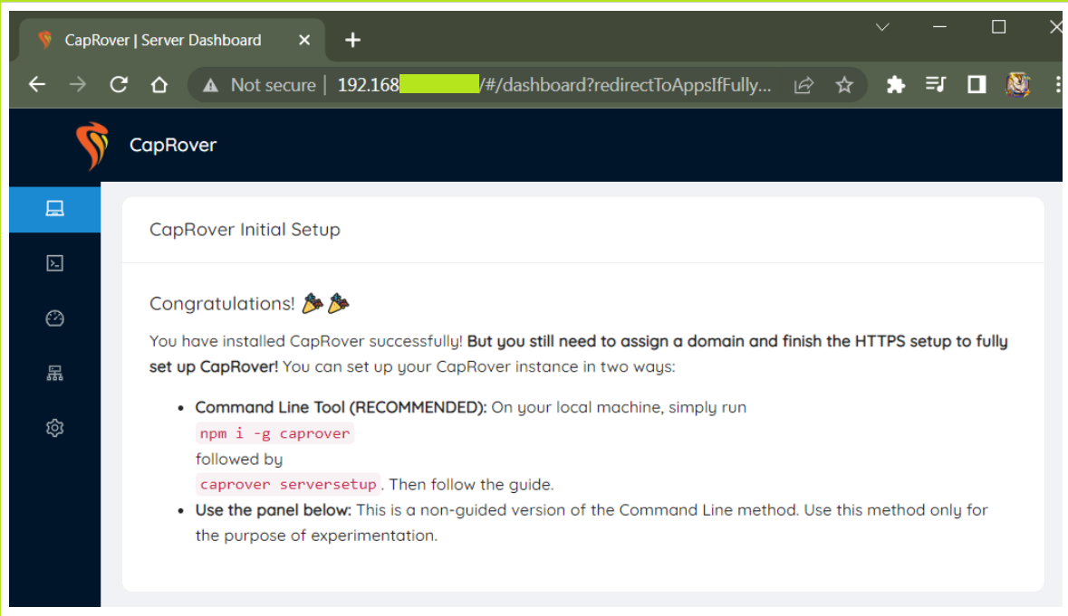 docker run -p 80:80 -p 443:443 -p 3000:3000 -v /var/run/docker.sock:/var/run/docker.sock -v /captain:/captain caprover/caprover