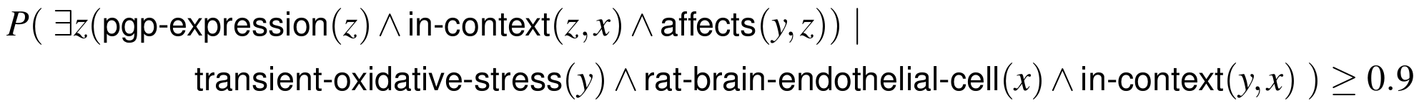 The three class slots take any class identifier (here shown by class name for simplicity), whereas the qualifier and the relation come from closed lists of a few possible values. Informally, the example above means that whenever there is an instance of "transient oxidative stress" in the context of an instance of "rat brain endothelial cell" then generally (being defined as in at least 90% of the cases) it has a relation of type "affects" to an instance of "Pgp expression" that is in the same context. Formally, it corresponds to this logical formula (in a bit of a non-standard notation using conditional probability):