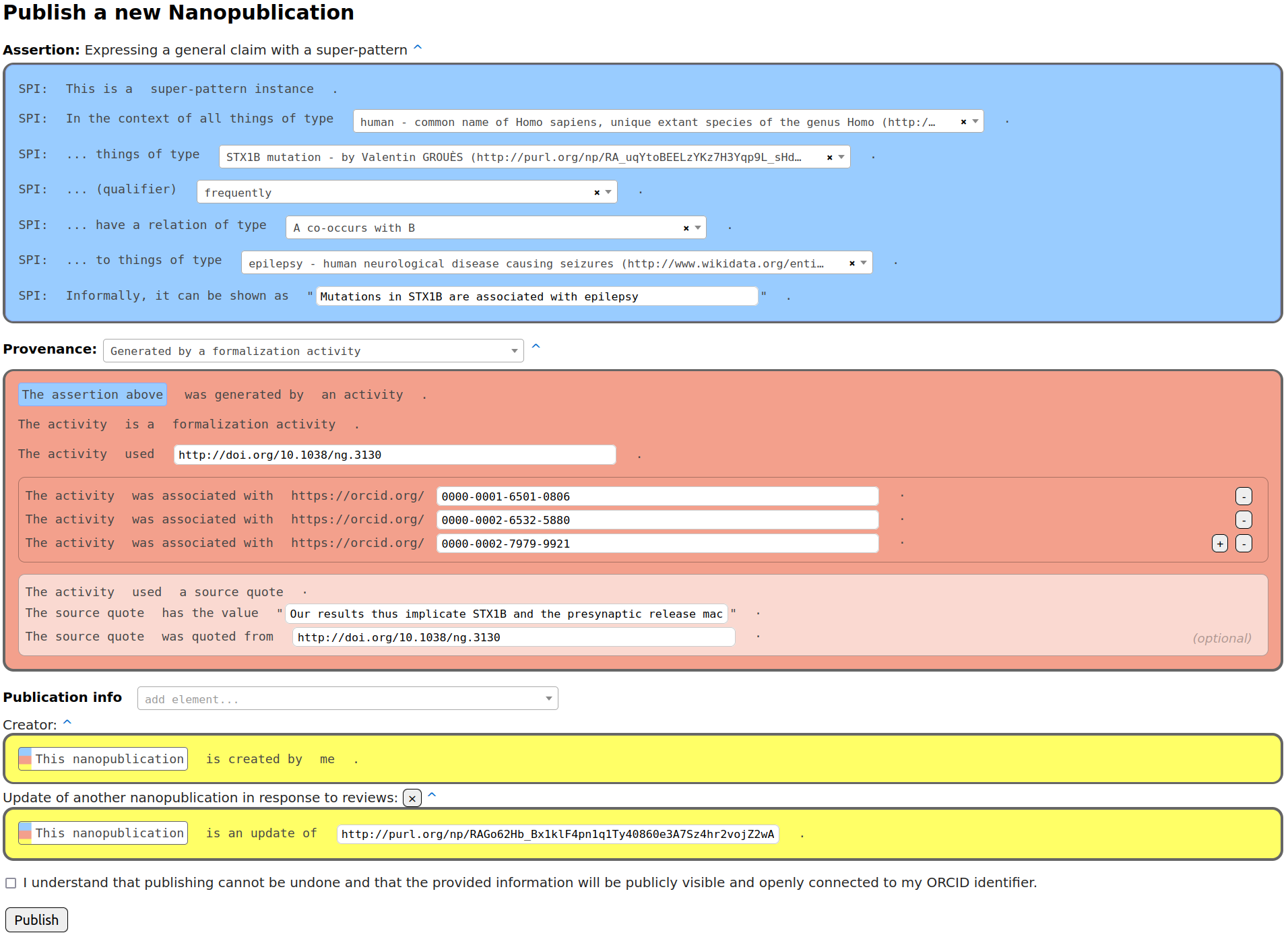 Apart from the actual formalization in the assertion part of the nanopublication (blue), this also involved specifying the provenance of that formalization (red) and further metadata (yellow). The provenance in this case states that the assertion was derived by a formalization activity taking an existing paper as input. This interface provides auto-completing drop-down menus and maps the result to the logic language RDF in the back. I won't go into the details of defining new classes and reviewing (both done with nanopublications and Nanobench too), but you can have a look at the preprint of our paper [2] on that.