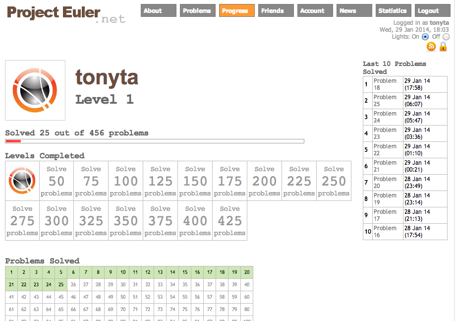 Anyway, you all should check it out. It might look intimidating at first, but the first 25 can definitely be solved with simple algorithms. If you want an easier version for a warm-up, try Sphere Online Judge (SPOJ) to get started.