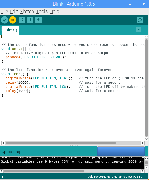 This file is then needs to be uploaded to the Arduino where it will be run. You can do this using the IDE by clicking on the right-arrow button.