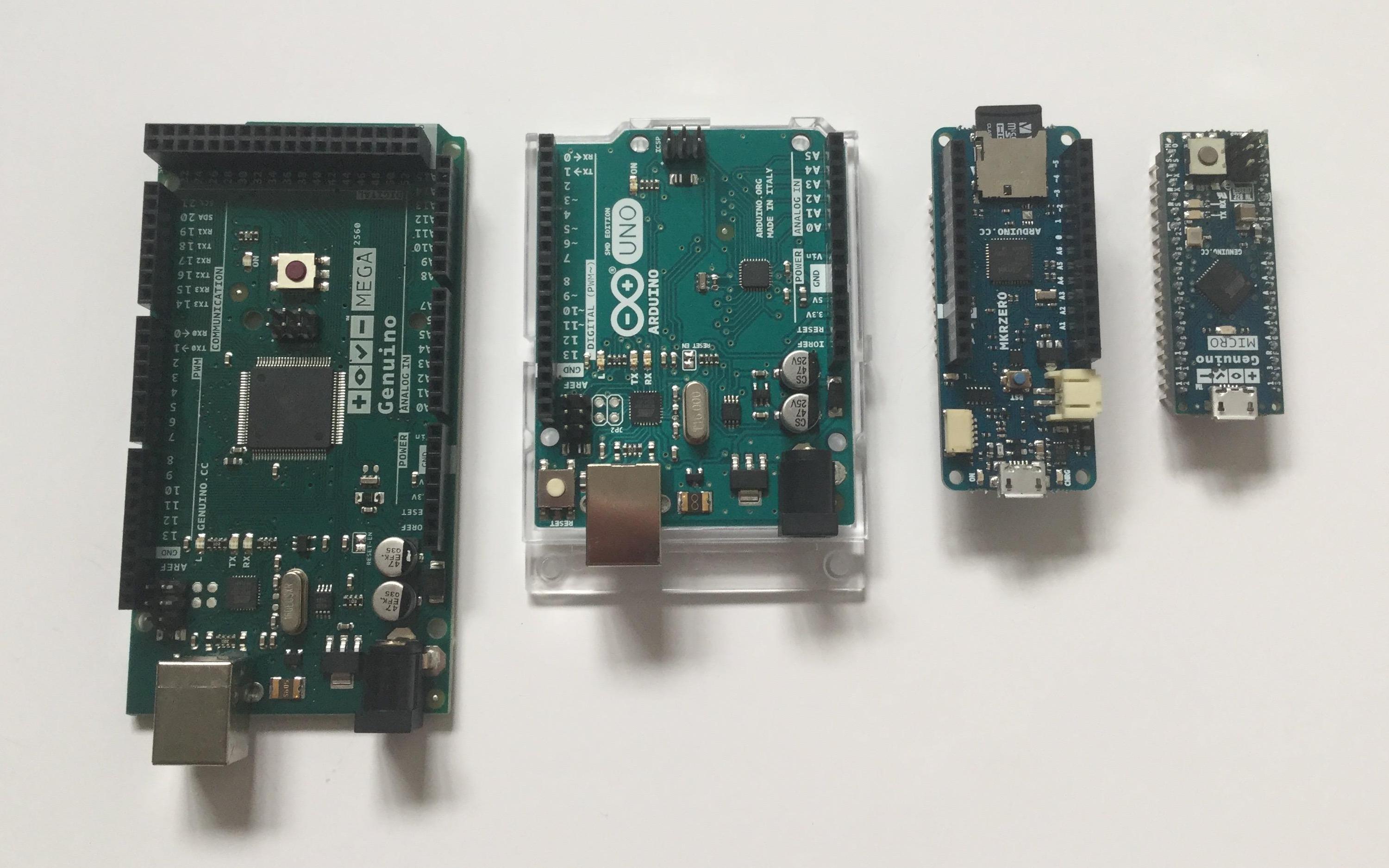 Official Arduino/Genuino models come in a range of sizes. from left to right: Leonardo, Uno, MKR Zero and Micro.
