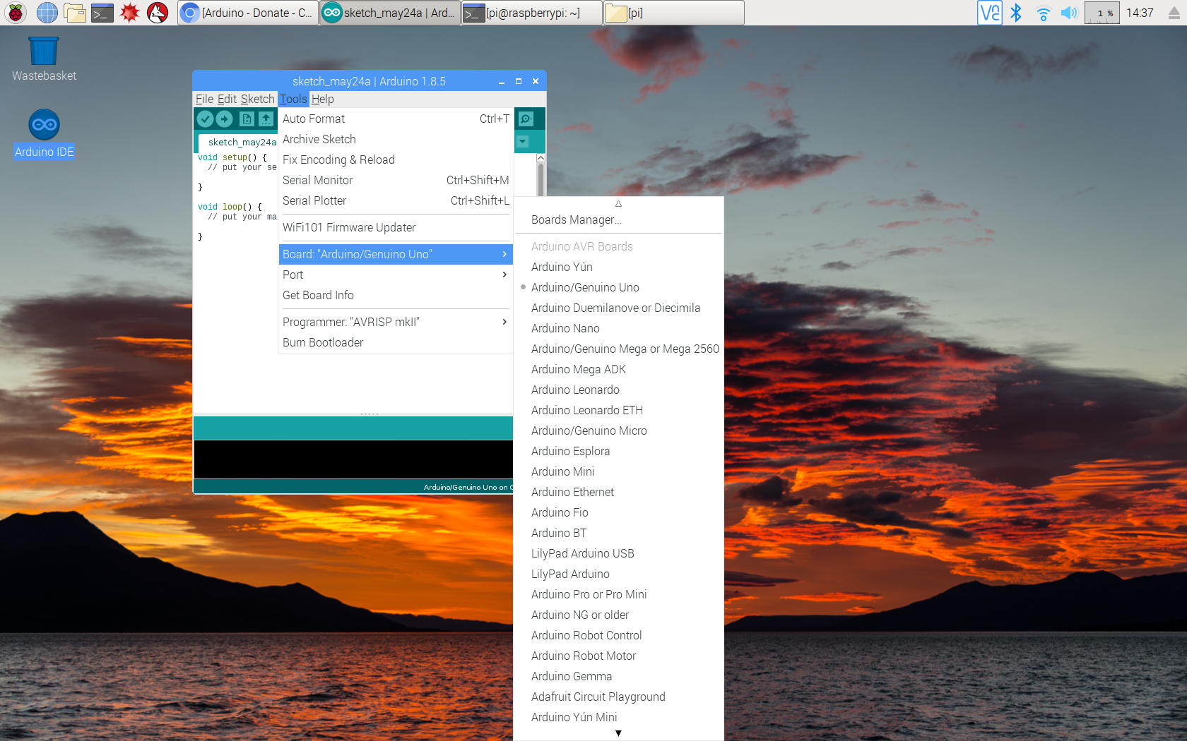 To setup the IDE, you need to tell it which type of Arduino you're using and how it is connected to your computer. To set the type of Arduino, click on Tools then select Board and chhoose your device from the list. If you're using an Arduino compatible board made by another manufacturer (e.g. an Arduino Feather) then you will need to download additional board drivers. Check the manufacturers documentation for how to do this.