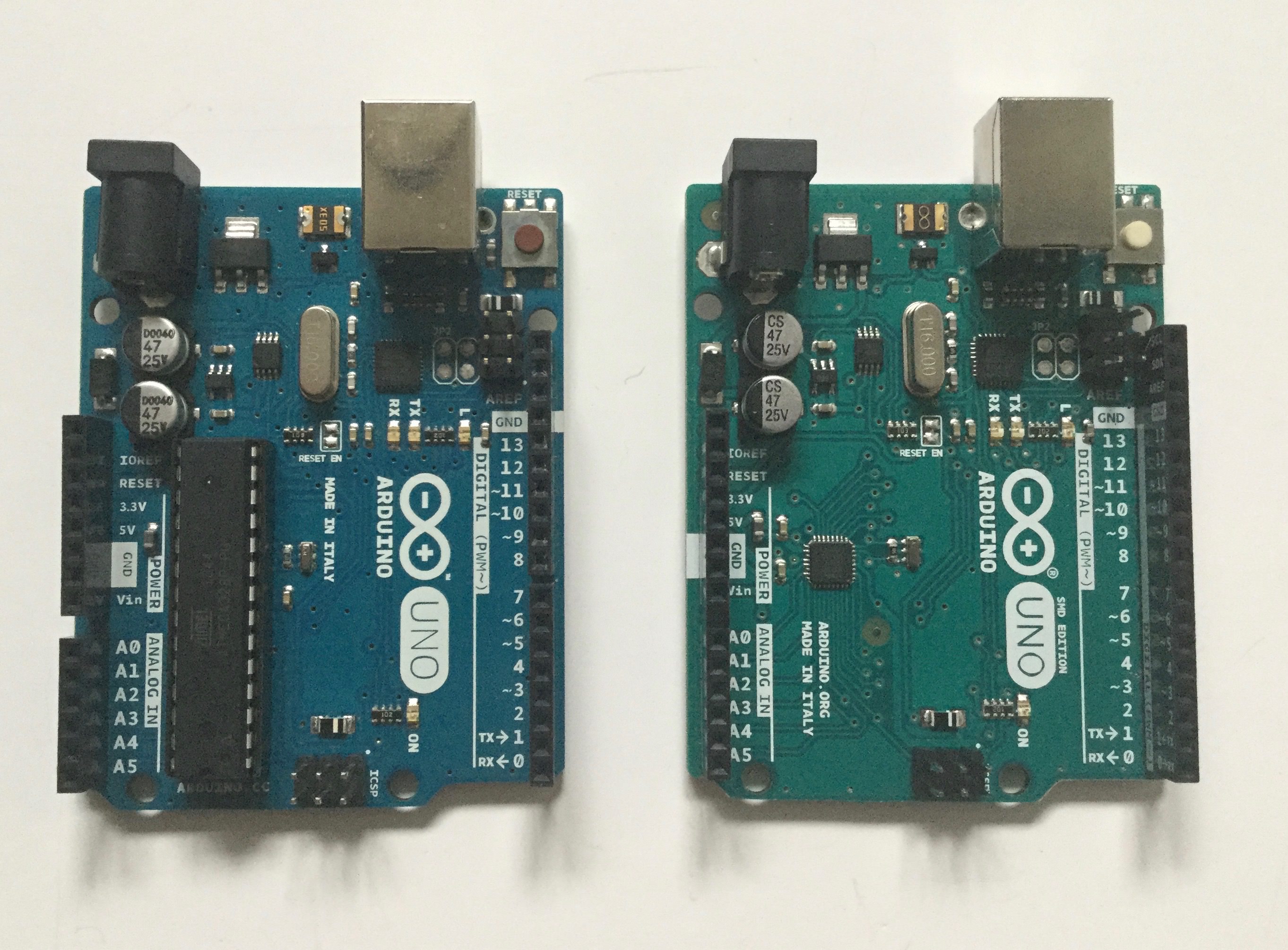 The most common Arduino model, and one often used for prototyping is the Uno. There have been several different versions of the Uno, the latest being Rev. 3 (right below). You can see that the older versions have a much larger Intergrated Circuit (chip) - this is the ATMega328.