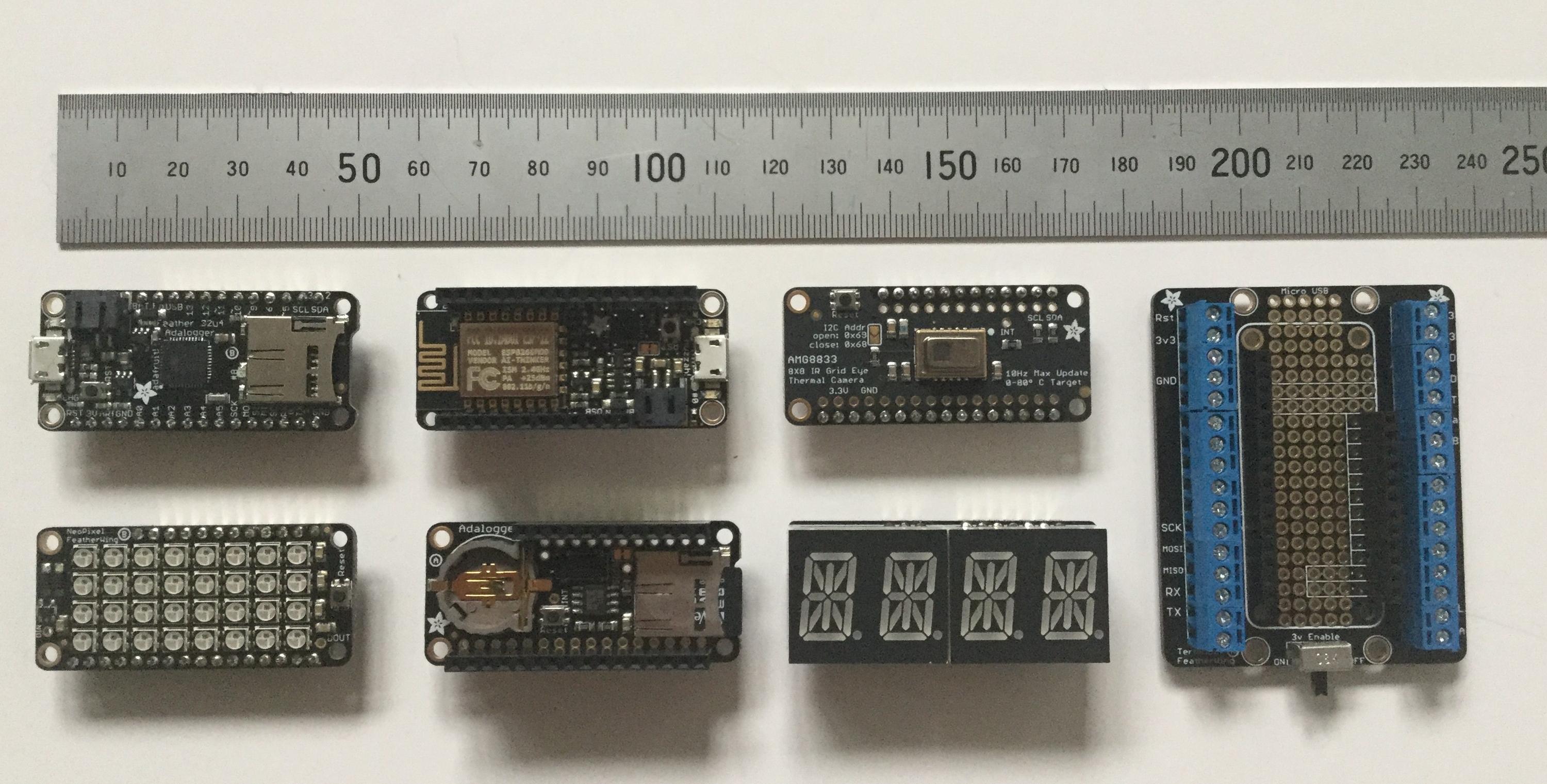 Adafruit also make a range of smaller boards called Feather, which often have built-in addaitional hardware and also come with their own range of add-ons (called Wings).